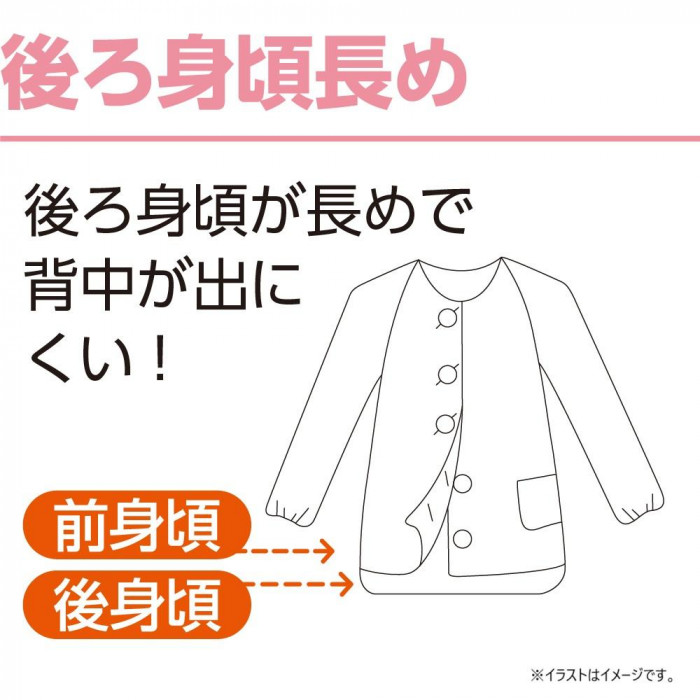| 後ろ身頃長め、動きやすいラグラン袖。大きめボタン・ウエスト調節ゴム・名前書きスペース付き。スムース素材で季節を問わず快適な着心地。 ※柄は若干変更になる場合もございます。 |