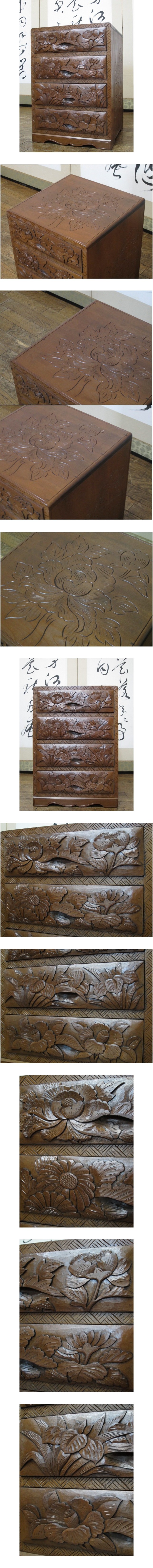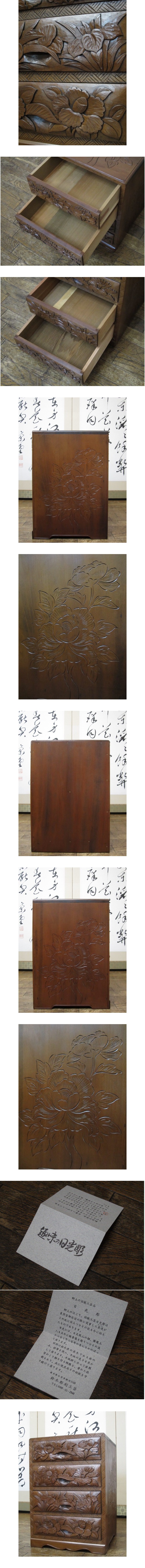 逸品 伝統工芸 日光彫り 総無垢材 牡丹 彫刻 上手造り 4杯抽斗 民芸 箪笥/小箪笥/手許箪笥/小物入れ/整理タンス/チェスト(検)軽井沢彫り 收藏