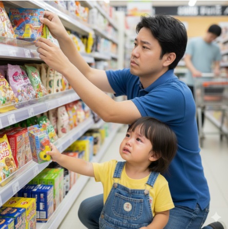 ■ レジの前で、子供が握りしめた100円のお菓子を諦めさせる。