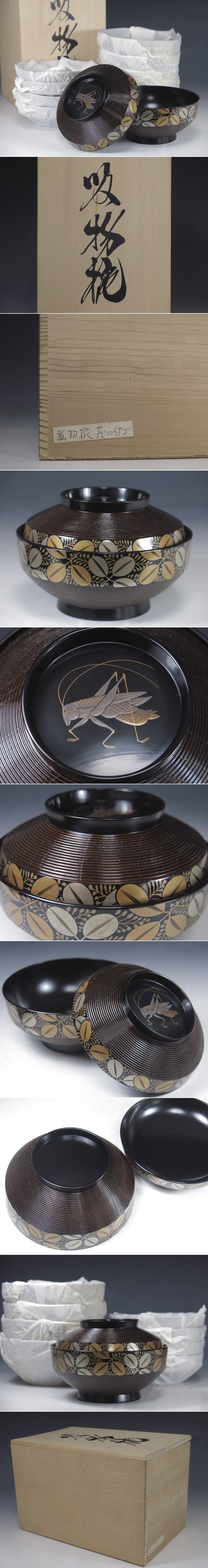 | 商品名 | 未使用 懐石具 本うるし塗 秋草 萩に蝗図 イナゴ 金蒔絵 糸目 吸物椀 五客 煮物椀 黒塗 木製 漆器 漆芸 漆塗 茶道具 懐石道具 箱付 |