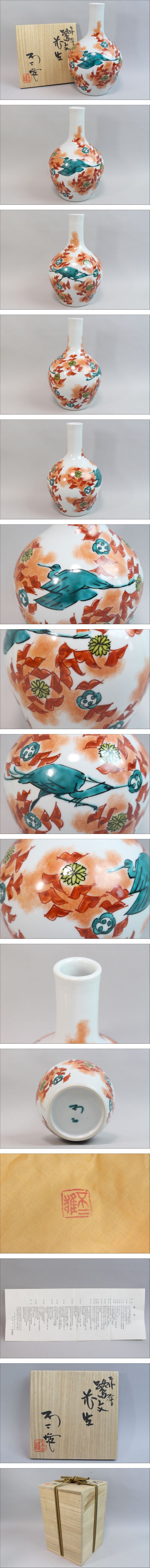 九谷焼 北出不二雄 赤絵 鷲と鶴 色絵 花生 一輪挿し 花瓶 高さ約20㎝ 共箱・共布・陶歴付き 收藏