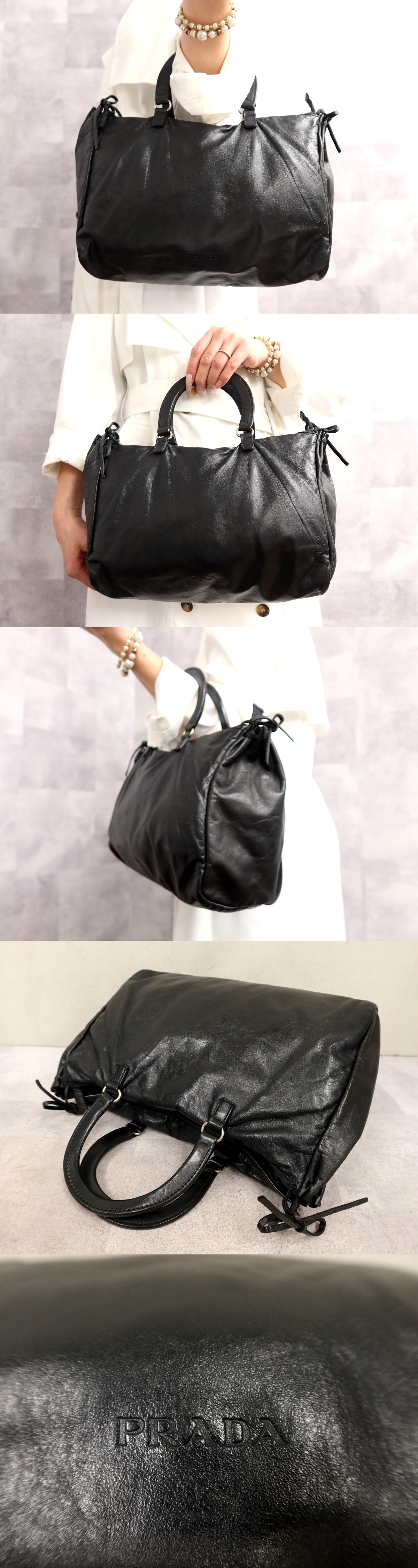 ●超美品●PRADA プラダ●ロゴ型押し●カーフ レザー 本革●トート ハンド バッグ●黒●シルバー金具●腕掛け●イタリア製●収納●Js66614 收藏