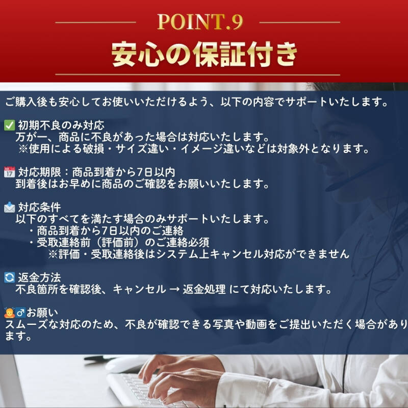・本製品は海外インポート品です。工場から直接仕入れることで、この高いコストパフォーマンスを実現しております。 ・発送前に日本国内で1点ずつ丁寧に検品を行っておりますが、製造工程や輸送時における微細な擦れ跡などがある場合がございます。あらかじめご了承の上、お買い求めください。 ・万が一、使用に支障をきたすような初期不良や破損があった場合は、必ず【受取評価前】にご連絡をお願いいたします。誠心誠意対応させていただきます。 |
