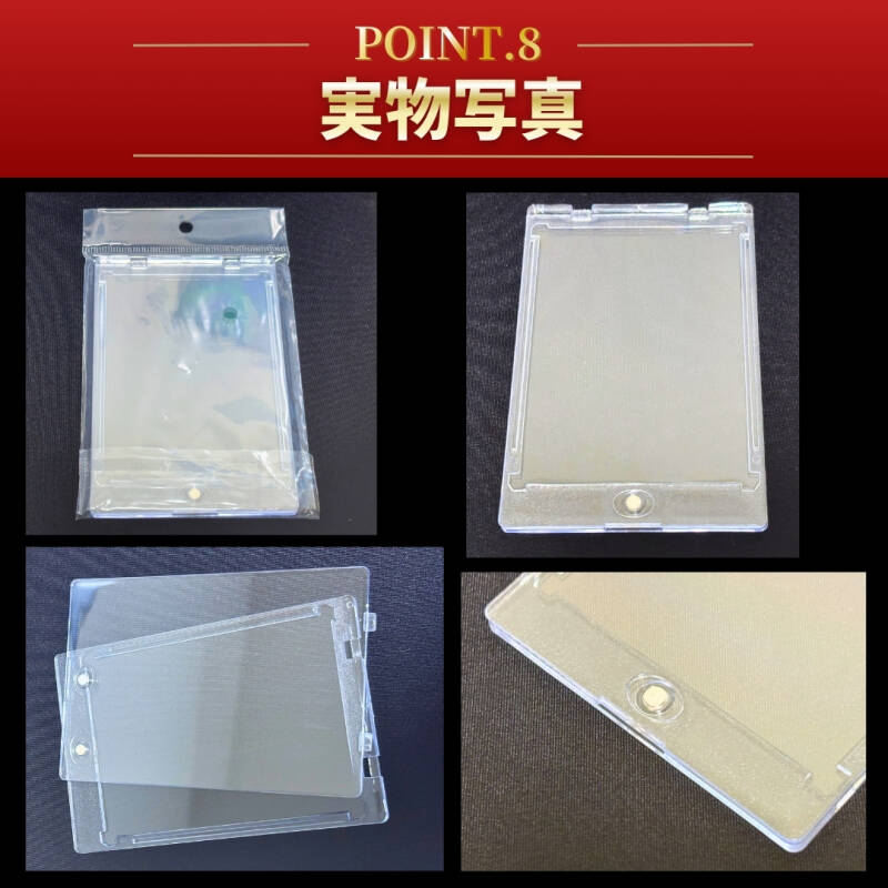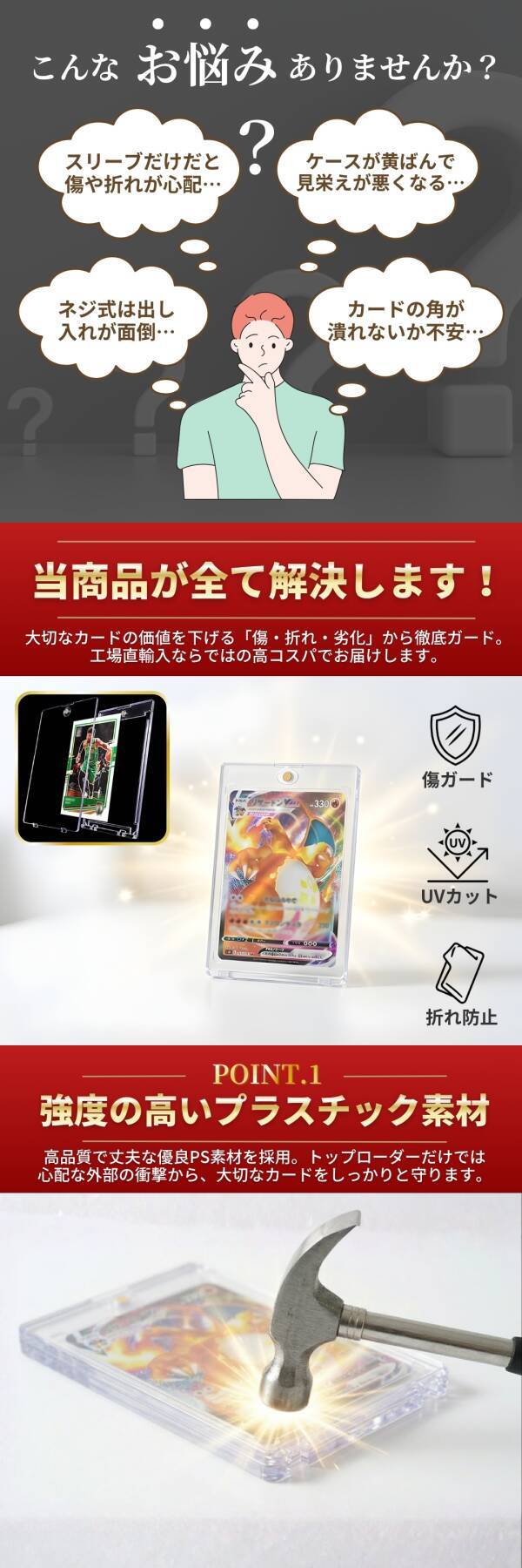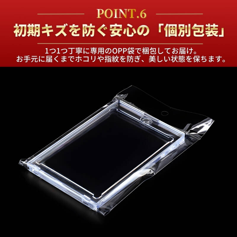 【商品の魅力】 ◆ 黄ばみにくい高品質PS素材 透明度が高く、経年劣化による黄ばみが発生しにくい優良素材を採用。大切なカードをいつまでも美しくディスプレイできます。 ◆ 徹底した角折れ防止設計 内側の四隅にスペース(くぼみ)を設けることで、カードの角へのダメージを完全に防ぎます。 ◆ マグネット式で出し入れ簡単 ネジ式のスクリューダウンのような手間は一切不要!強力マグネットでピタッと閉まり、スムーズにカードの入れ替えが可能です。 ◆ 嬉しい個別包装 1つ1つOPP袋で個別包装されているため、お届け時や保管時の指紋・擦り傷を防止します。 【商品仕様】 ・サイズ(外寸):約 幅73mm × 高さ110mm × 厚さ7mm ・サイズ(内寸):約 幅65mm × 高さ90mm × 厚さ1mm(35pt対応) ・カラー:クリア(透明) ・材質:高品質PS(ポリスチレン) ・枚数:20枚 ※遊戯王、ポケモンカード(ポケカ)、デュエルマスターズ、MTG、ヴァイスシュヴァルツなど、一般的なミニサイズ~レギュラーサイズのカードに対応しています。(インナースリーブに入れた状態でも収納可能です) |