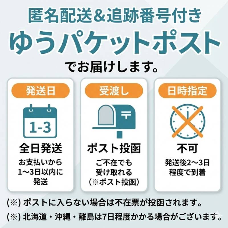 ・配送方法:クリックポスト(匿名配送・追跡あり) ・発送目安:ご購入後、1〜3日以内に発送いたします。 ・梱包:破損対策を施し、環境に配慮した簡易包装でお届けします。 |