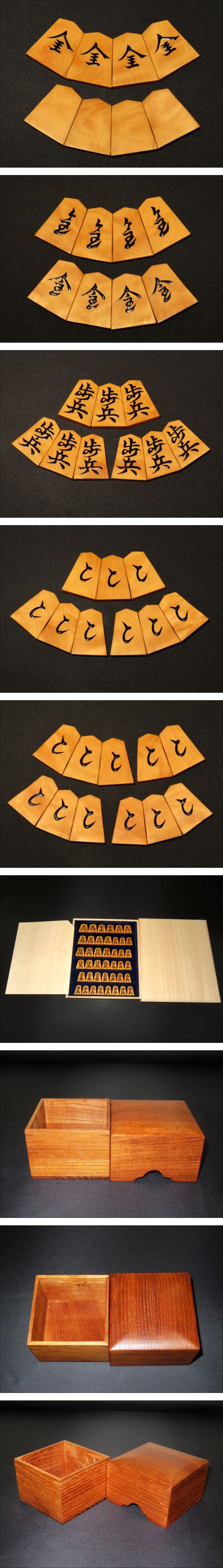 木地は御蔵島黄楊杢。御覧の通り非常に味の良い木地です。全ての駒の表裏をUPいたしましたので是非ご覧ください。