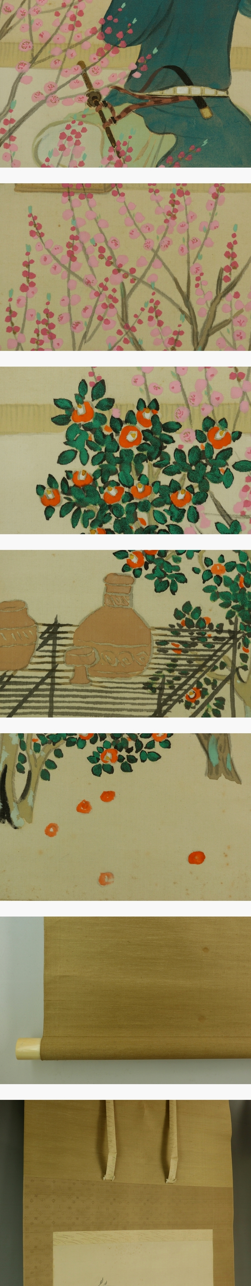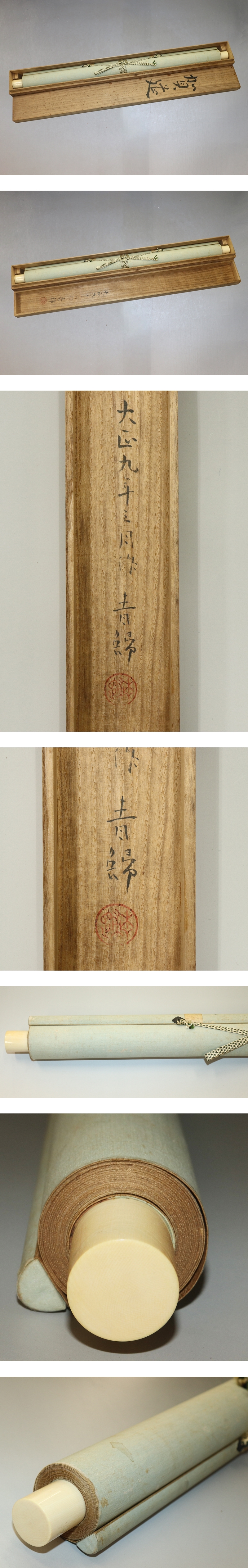 西村青帰 明治16(1883)年3月14日~昭和20(1945)年 明治~昭和期の日本画家。 本紙は、染み、汚れ、軽い折れがあります。 表装は、染み、汚れ、軽い折れ、皺、虫食いがあります。 【サイズ】 作品 横約51cm×縦約145cm 表装 横約66.5cm×縦約231cm |