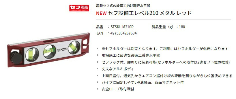 タジマ TAJIMAセフ設備工レベル210 メタル レッド品番:SFSKL-M210R着脱セフ式の設備工向け職専水平器■製品情報・製品重量:180g■特長・※セフホルダーは別売となります。ご利用にはセフホルダーが必要になります・現場施工に最適な設備工職専水平器・セフフック付。腰周りに装着可能(セフホルダーへの取付は2連セフ下位置推奨)・丈夫なアルミボディ・上面目盛付。通気孔からエアコン据付け板の距離を測りながらも位置決めできる・パイプに固定しやすいV溝底面、背面マグネット付・安全ロープ取付環付■仕様・外形サイズ:210mm×50mm・気泡管:水平・垂直・45°・測定面V溝・マグネット付(マグ力5kg)