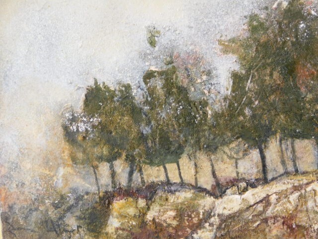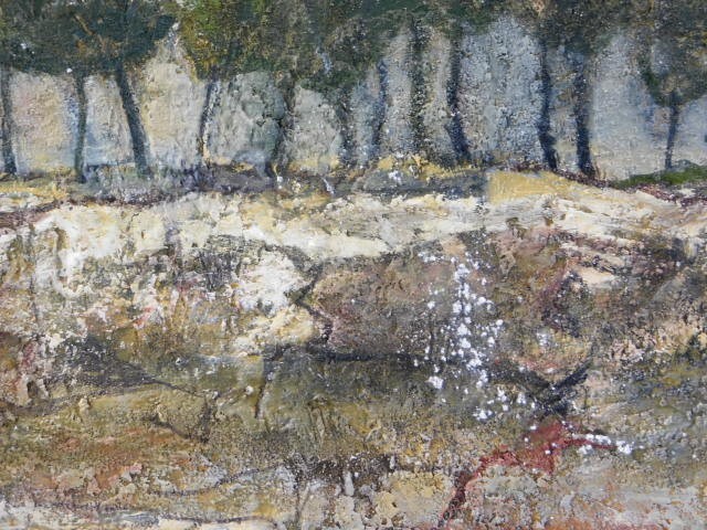 ★内容(感想) ・くすんだ色調で木の絵が描かれています。油絵だと思いますが、詳しい画材はわかりません。厚く塗られている感じで、触るとボコボコしています。 ・絵にヒビ割れがあります。