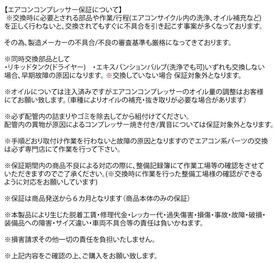 | ※注意 | ※適合車種欄の該当車両であっても不適合の場合がありますので、必ず純正品番号または部品番号/形状等をご確認の上、ご購入下さい。 ※お客様のご都合による返品交換対応は受け付けておりません。 ※入荷時期により商品仕様が変更される場合が御座います。 ※保証期間は発送日より6ヵ月間となります。 ※初期不良(発送日より1ヵ月)は弊社が送料を負担いたします。 ※お取付に関する対応・サポートサービス等は行っておりません。 ※海外製の為、極稀に必要に応じて多少の加工や調整、コーキング等を必要とする場合が御座います。 ※説明書は付属されておりませんのでご了承ください。 【交換品について】 ※不具合があった際、交換品の先出しは致しておりません(※画像/動画が必要となります) ※商品に不具合があった際は必ず先に不具合が確認できる箇所の画像/動画/エラーコード等が必要となります。 ※大変申し訳ございませんが確認出来ない解らない等は交換品出荷不可/返品返金不可/キャンセル不可/保証対象外となりますのでご了承ください。 ※専門店にて作業を行って下さい。 ※取付は自己責任にてお願い致します。 【エアコンコンプレッサー保証について】 ※交換時に必要とされる部品や作業/行程(エアコンサイクル内の洗浄、オイル補充など)を正しく行わないと、交換されてもすぐに不具合を引き起こす事案が多くなっております。 その為、製造メーカーの不具合/不良の審査基準も厳格になってきております。 ※同時交換部品として ・リキッドタンク(ドライヤー) ・エキスパンションバルブ(洗浄でも可)いずれも交換しない場合、早期故障の原因になります。 ※交換していない場合 保証対象外となります。 ※オイルについては注入済みですがエアコンコンプレッサーのオイル量の調整はお客様にてお願い致します。(車種によりオイルの補充・抜き取りが必要な場合があります) ※必ず配管内の詰まりやゴミを除去してから組付けてください。 配管内の異物が原因によるコンプレッサー焼き付き/異音については保証対象外となります。 ※手順どおり取付け作業を行わないと故障の原因となりますのでエアコン系パーツの交換は必ず専門店にて作業を行って下さい。 ※保証期間内の商品不良による対応の際に、整備記録簿にて作業工場等の確認をさせていただきますのでご了承ください。(※交換時に作業を行った整備工場様の確認ができるように対応をお願いしています) ※保証は商品発送から6カ月となります(商品本体のみの保証) ※本製品により生じた脱着工賃・修理代金・レッカー代・過失傷害・損傷・事故・故障・破損・装備品への障害・サイズ違い・車両不具合等の責任は負いかねます。 ※損害請求その他一切の責任を負担いたしません。 ※上記内容をご確認の上、ご購入をお願い致します。 |