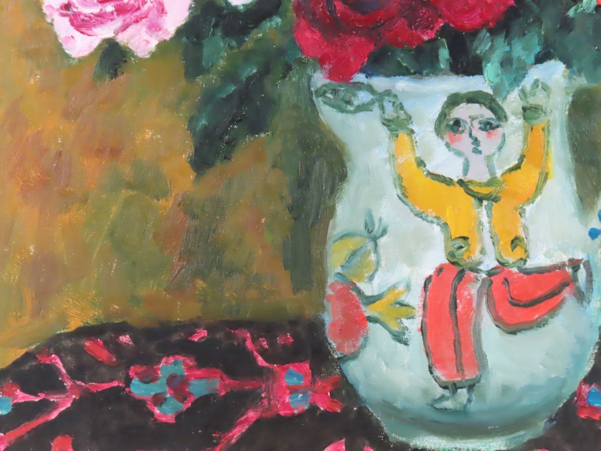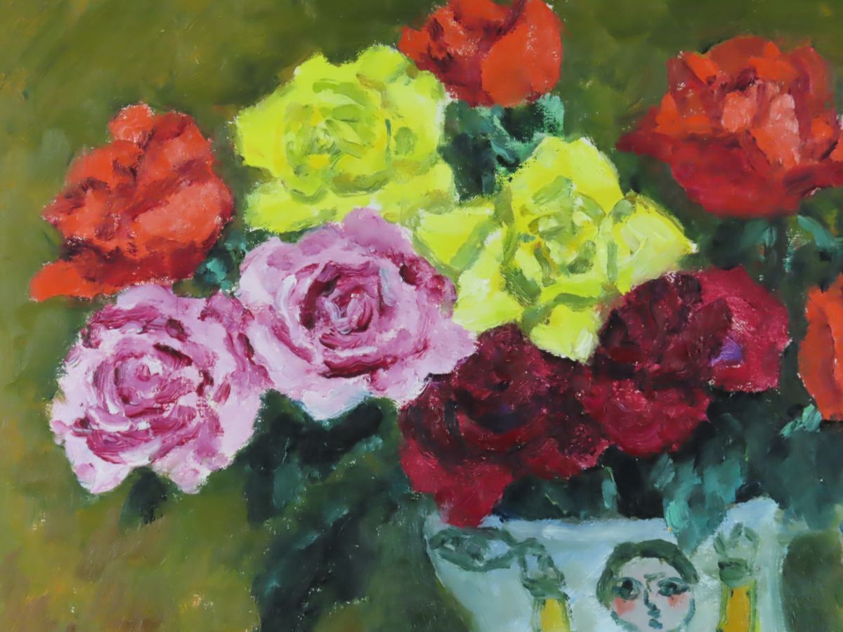 穂高「真作」小寺健吉 「壷の薔薇」 油彩 8号 日動画廊シール 豪華額縁 收藏