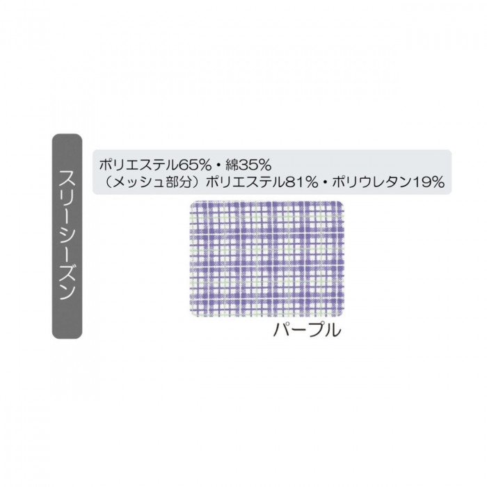 | 素材・材質 | スリーシーズン:ポリエステル65%、綿35% メッシュ部分:ポリエステル81%、ポリウレタン19% |