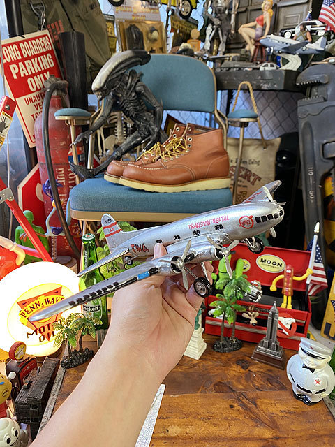 今はなきTWA(トランスワールド航空)のプロペラ旅客機、ボーイング307を再現した・・・・レトロクラシックな飛行機のブリキオブジェです。
