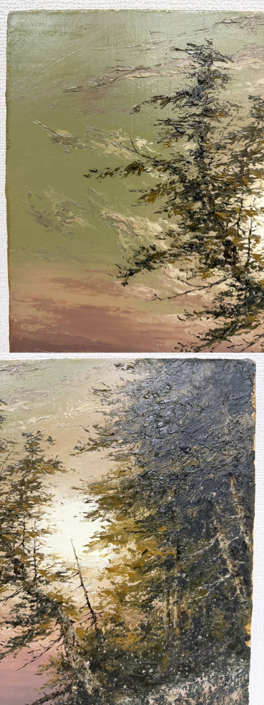 柔らかな光に包まれた、静かな湖畔の風景画です