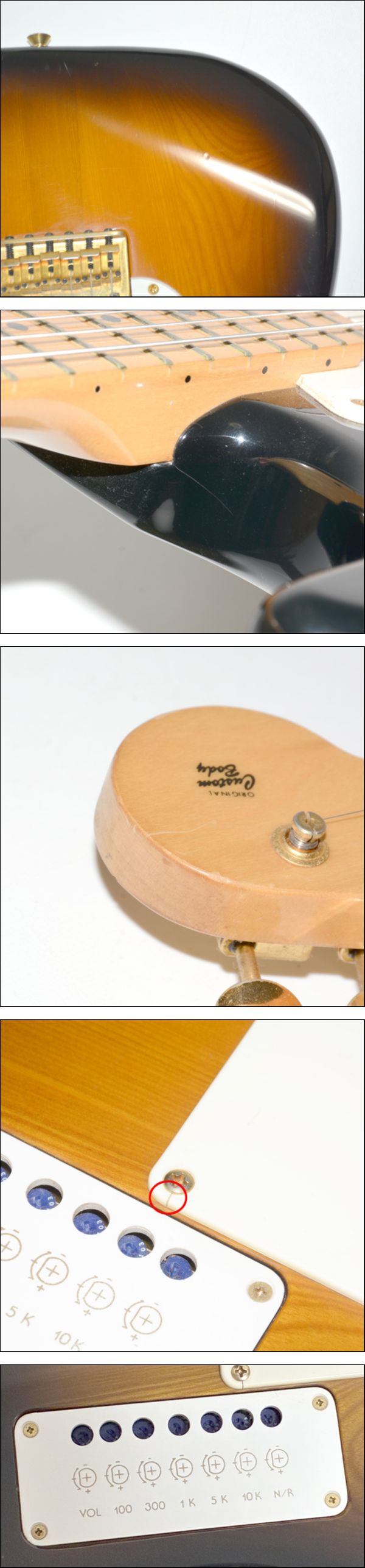 こちらはUSED品です。 ・ボディ正面、側面にスレ、キズ、小さな打痕が見られます。 ・ボディ背面、底面にスレ、キズが見られます。 ・ネックに多少のスレ、キズ、打痕が見られます。 ・ネックジョイントに塗装クラックが見られます。 ・ヘッドに多少のスレ、キズ、打痕が見られます。 ・指板に多少のスレ、キズが見られます。 ・ペグ・ブリッジ・ジャック等金属部分に多少のスレ、小キズ、メッキはがれ、くすみ等が見られます。 ・ピックガードにスレ、キズ、多少の汚れが見られます。 ・ピックアップに多少のスレ、キズが見られます。 ・ノブに多少のスレ・くすみ、小キズが見られます。 ・セレクタースイッチに多少のスレ、キズ、クラック、僅かな汚れが見られます。 ・ネジに多少のスレ、小キズ、メッキはがれ、僅かなサビが見られます。 ・バックプレートにスレ、キズ、一部のネジ付近に割れが見られます。 ・電池ボックスに多少のスレ、キズが見られます。 ・ケースにスレ、キズ、汚れ等が見られます。 全体的にスレ、キズ、多少の打痕等が見られますが 上記の点以外に目立つキズ、ダメージ等は見られない状態です。 ネックはほぼストレートの状態です。 (現在の弦高は12Fで、1弦側:約1.5mm、6弦側:約2.0mm) 重量:約3.3kg、ナット幅:約42mm、スケール: 約648mm |