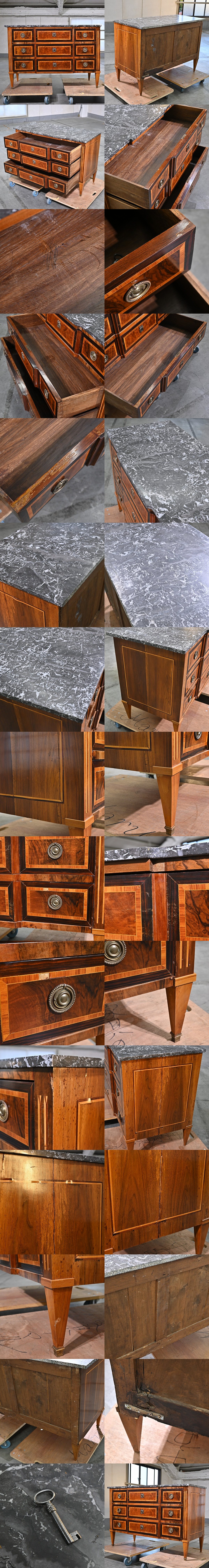★フレンチアンティーク ルイ16世様式 サイドボード ウォールナット材 大理石天板 木象嵌 コモード リビングチェスト 収納 ドロワー 真鍮 收藏