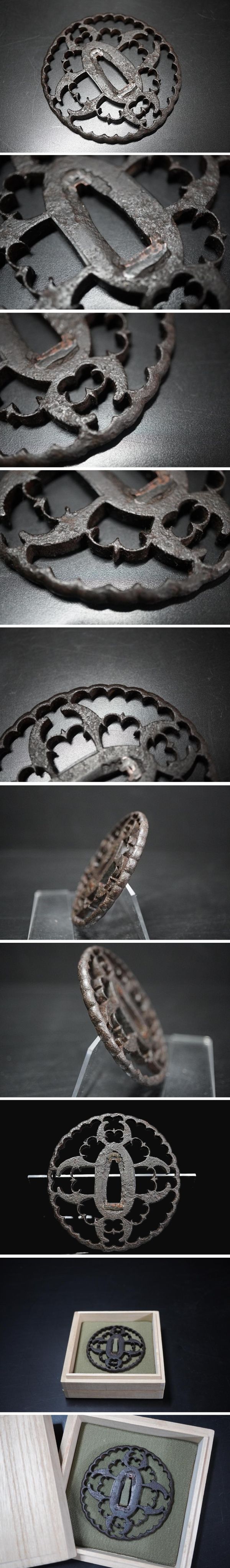 ご覧いただきありがとうございます。 刀鍔 赤坂透 鉄地 四方抱茗荷雁金繋透鍔 刀装品 鍔箱付です。 擦れキズ、サビ、汚れ等あります。