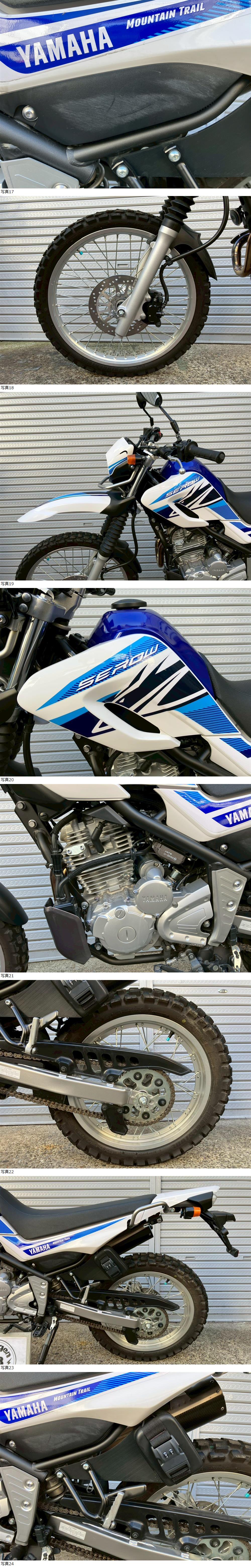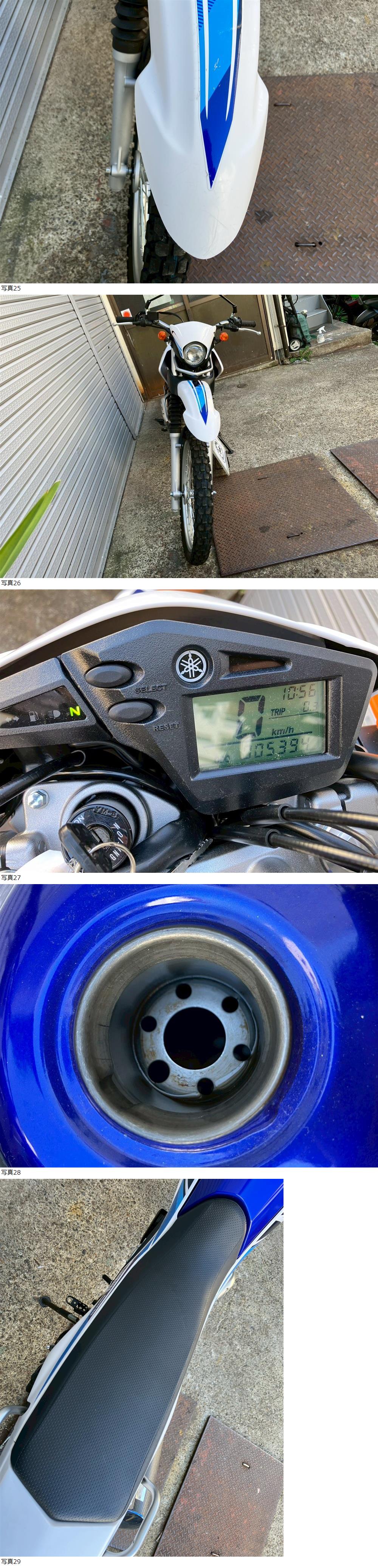 | 商品説明 | この度は当出品車両をご覧頂きまして誠に有難う御座います。 他にも複数台出品がございますので宜しければご覧ください! ご入札頂けた際には文末にありますお取引詳細にご同意頂けたものとさせて頂きます。 下記車両詳細・お取引詳細になりますので必ずご一読くださいませ! また、直接お越しいただいた方にその場で販売することもあるため予告なしに出品の取り消し等をする場合も御座います。 よって、落札前には一言コメント欄にてご一報頂けますと幸いです。予めご了承下さい。 〜〜車両詳細〜〜 メーカー:ヤマハ 車種:セロー250-3 年式:2018年式 色:ホワイト&ブルー 鍵:純正キー2本 排気量:250cc 走行距離:5,394km 燃料供給装置:インジェクション フレームNo:DG31J-000 自賠責:なし 別途 代行手数料33,000円・ナンバー代800円で承ります。自賠責12ヵ月7100円で登録代行致します。 お気軽にお問合せ下さい。 ・外観 ETC車載器とSP忠男製パワーボックスパイプ、チタンカーボンマフラーが装備されてます。 小傷等有りますが、全体的に綺麗で好印象だと思います。 タイヤに多少ヒビが見られます。 ・エンジンセルにて始動O K! 吹け上がり良好! 確認箇所は以下となります。 スピードメーター:作動OK! ヘッドライト:ハイロー点灯! ウィンカー:前後左右点灯! テール:尾灯・ブレーキ共に点灯! ナンバー灯:点灯! ホーン:作動OK! ★別途部品交換受け付けます! ・タイヤ前後交換など!詳細は直接お問い合わせくださいませ! エンジンオイル・タイヤ交換など! 詳細は直接お問い合わせくださいませ! *上記ご利用の際は部品の在庫状況によりお引き渡しまでにお時間を頂戴する場合が御座います。 〜〜お取引詳細〜〜 ※ご注意ください※ 出品車両はあくまで現状販売となります。走行点検などは行っておりません。 良好・好印象などの表記に関しても車両の状態を確実に保証するものではなく 細かい程度の差なども含めあくまで当方の主観でありますこと重々ご承知置き下さい。 特別に気になる箇所など(外観に限ります)がある場合は直接ご相談ください。 ご指定いただきました箇所のお写真を添付をさせていただきます。 (あまりにも多い場合はご対応致しかねます。) 上記を踏まえまして現車の確認は大歓迎です。 細かい箇所など気になる方は是非とも現車確認を行ってください! (予約制となりますので直接お問い合わせください。) 一般の二輪販売店と同様の点検・整備は行っておりません。 車両に関する一切の保証等も御座いませんので自走でのお引き取りはお断り致します。 ある程度の知識があり落札後にご自身で整備の出来る方、或いは整備工場等にて分解整備を別途検討できる方、メンテナンスベースとしての使用などの落札を推奨しております。 明記してあること以外の確認はしておらず、また致しかねます。 目視できる消耗品以外のパーツに関しましても寿命のわからぬものなど御座います。 (中古品ですのでつい先程まで正常に作動していたにも関わらずお受け取りの際に状態の変化などある場合も十分御座います。例・電子機器、ワイヤー類など) 再三にはなりますが如何なる場合もお引き渡し後のキャンセル・クレームはお受け致しかねます。 現状販売というものを重々ご理解の上ノークレーム・ノーリターンでよろしくお願い致します。 原則キャンセルはお受け致しかねますが、止むを得ず落札者様都合でキャンセルされる場合には 落札金額の1割をキャンセル費用として頂戴させて頂きます。 上記取引内容に不安を感じられる方には二輪販売店等の整備・保証付き車両のご購入を強くお勧め致します。 ★直接引き取り・即引き取り大歓迎! 直接引き取りの場合、落札から1週間以内にお引き取り下さい。 それ以降日割りにて2,200円を別途頂戴させて頂きます。 *部品交換をご依頼の方は完成のご連絡から1週間以内となります。 ★配送OK! 主に配送業者に委託しております。ご自身で手配いただいても結構です。 レッドラインの金額を参考にしておりますのでお手数ですが費用に関しましては落札者様にて直接HPでご確認下さい。 発送元は埼玉県川口市となります。ご購入から配送までの目安は関東近郊で1〜2週間程度となるかと思います。(地域、期間により大幅に異なりますので納期が気になる方は直接レッドラインへお問い合わせ下さい。) 関東近郊の場合割増でお早めにお届けできる場合も御座いますので一度ご相談下さいませ!(対象外となる場合も御座います。) また、配送の場合もお取置き等の対応は致しかねますので落札後は速やかに配送依頼の手続きを行わせて頂きます。 ★車両のみの販売となりますので必要な場合のみ別途5,500円にて販売証明書の発行・発送を受け賜ります! ★新規アカウントの方、落札者様の評価内容によりましては、ご入札頂いても当方の判断で削除する場合がございます。予めご了承下さい。 ★落札後、24時間以内にお客様情報のご入力・落札代金のお支払いがいただけない