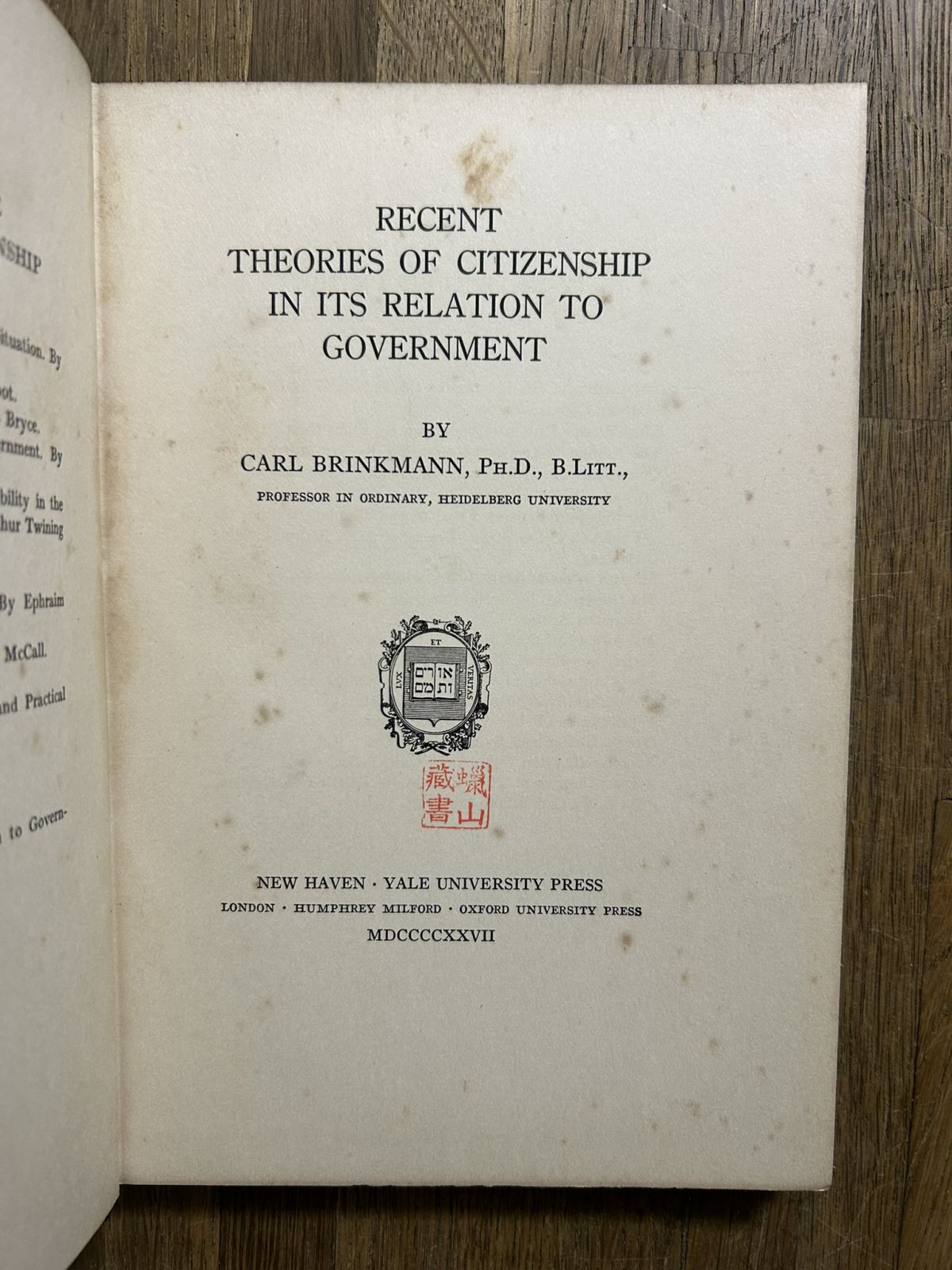 1927年 ブリンクマン 市民権理論と政府 Carl Brinkmann, Recent Theories of Citizenship in Its Relation to Government 英文洋書古書 收藏