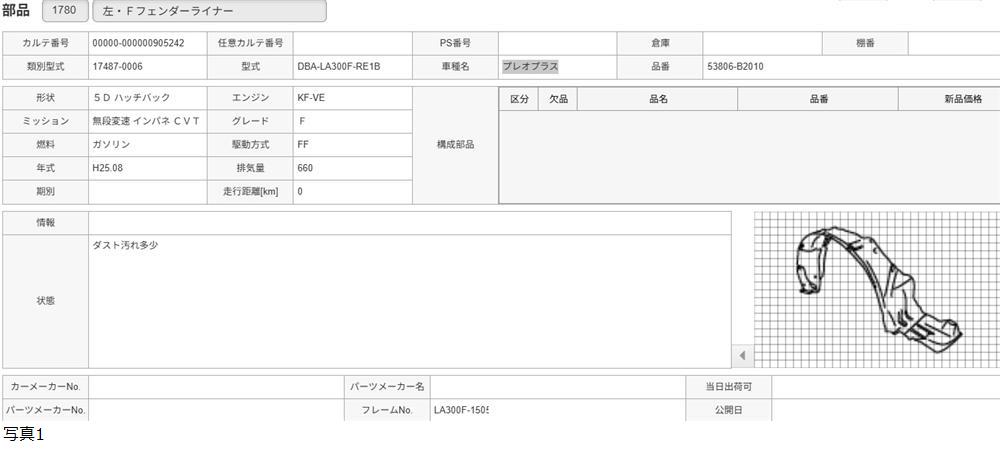 H25年 LA300F プレオプラス 左 フロントフェンダーライナー /送料 SS/905242 收藏