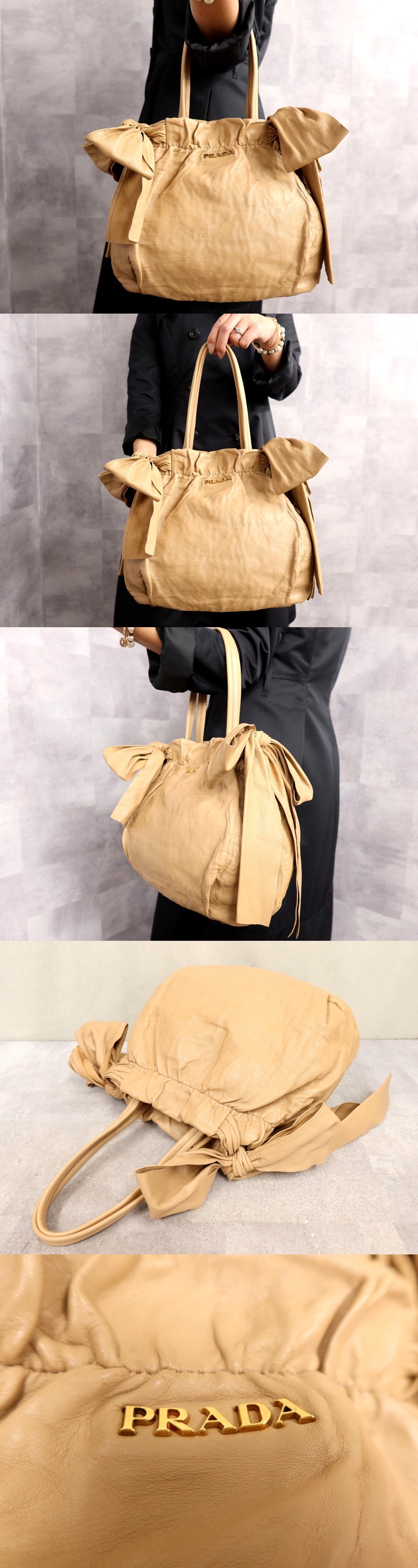 ●超美品●PRADA プラダ●リボン●ナッパ レザー 本革●トート ハンド バッグ●ライトブラウン●ゴールド金具●イタリア製●収納●Js63869 收藏