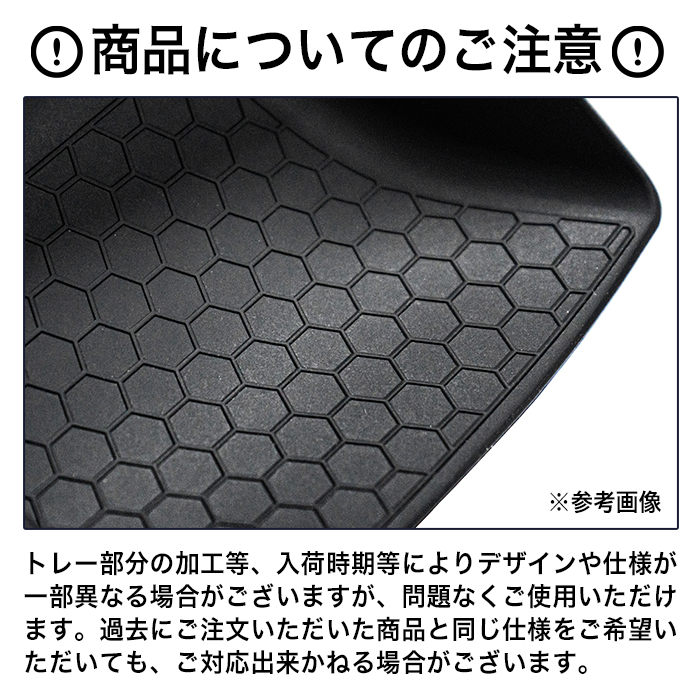 | 汚れや傷防止に最適!! 耐熱性の高いTPE素材を採用!裏面は滑りにくい加工を 施してズレも軽減でき、水で洗えてお手入れも簡単です!! ■適合車種:フリード GT5 / GT6 / GT7 / GT8 【適合グレード】 ・e:HEV AIR EX ・e:HEV CROSSTAR ・AIR EX ・CROSSTAR ・e:HEV AIR ・AIR ■年式:2024年6月(令和6年6月)〜 ■材質:TPE ■カラー ・ブラック ■セット内容:ラバートレーマット×5 ※型崩れしているような場合でも手で癖を戻してあげれば、綺麗な状態に戻ります。 気になる場合は両面テープを商品裏側に貼って頂ければ、更にフィッティングが良くなります。 |