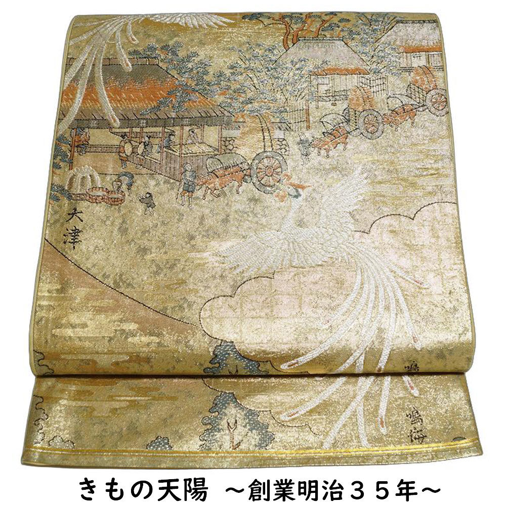 | 商品 説明 | シックな金色系の地に歌川広重 東海道五十三次の原・鳴海・大津の模様が織られた袋帯です。 未仕立て品、帯芯無しですが使用されております。 |