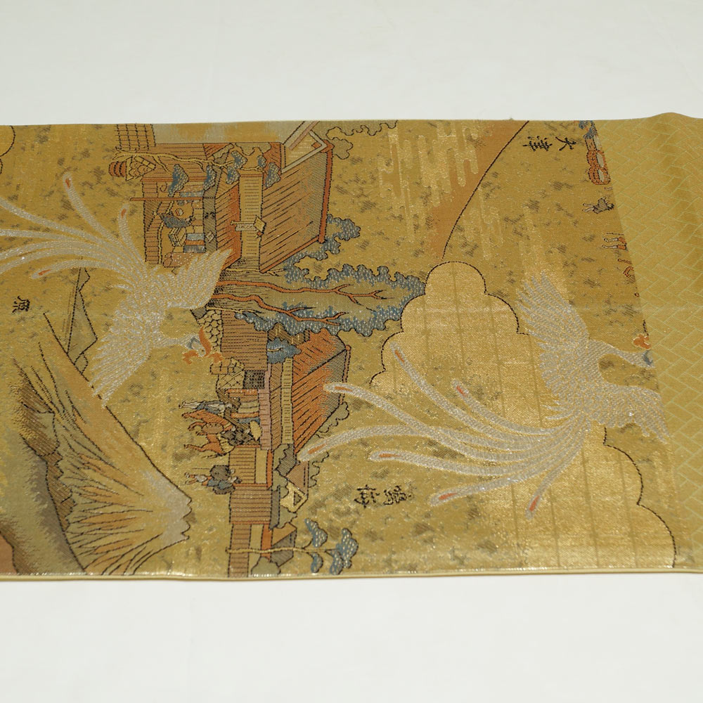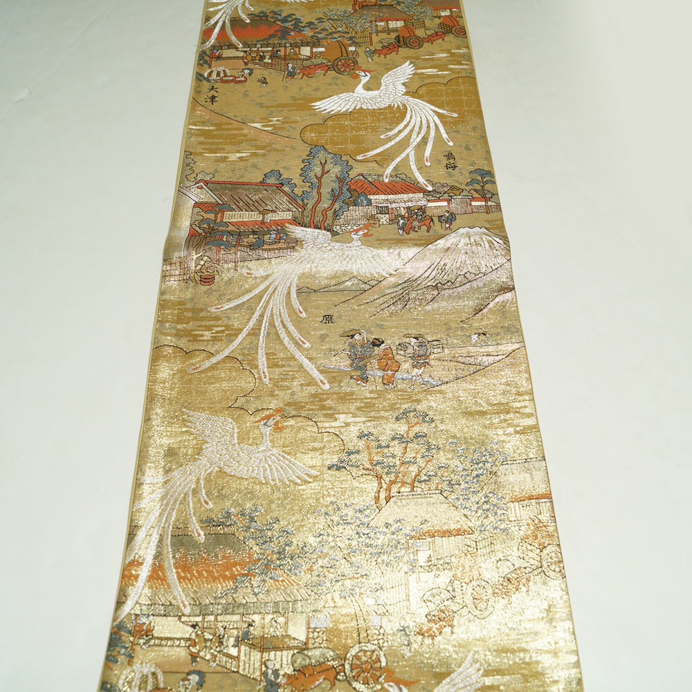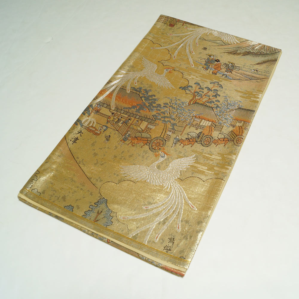 袋帯 未仕立て品 東海道五十三次模様 金糸 六通柄 金色系 正絹 中古 リサイクル着物 帯 フォーマル 袋帯 着物 天陽 收藏