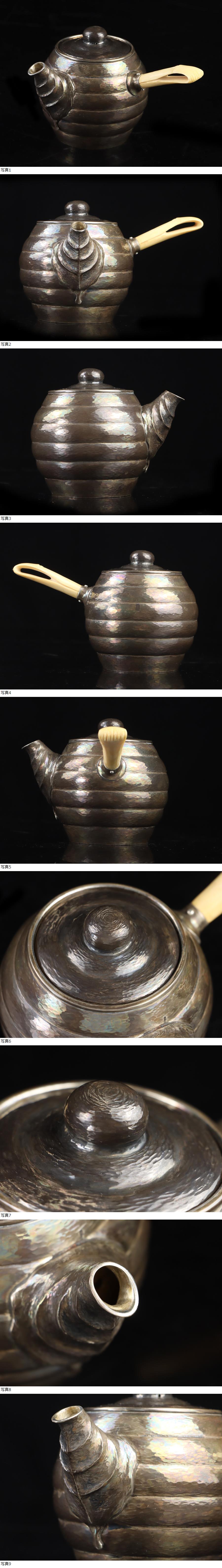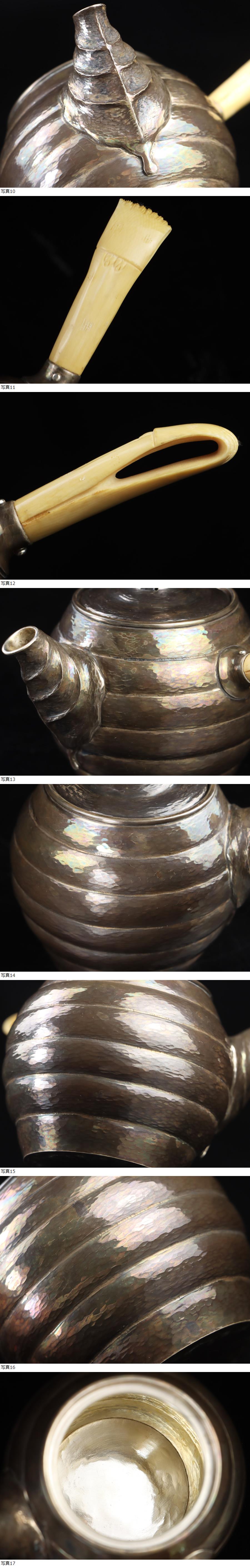 魁◆名人名工作 工藤 延寿 本人作 純銀製 葉造形 天然素材横手 煎茶 急須 銀純度99.6% 銀急須 総重量164g 最上手名作茶道具 横手急須 收藏
