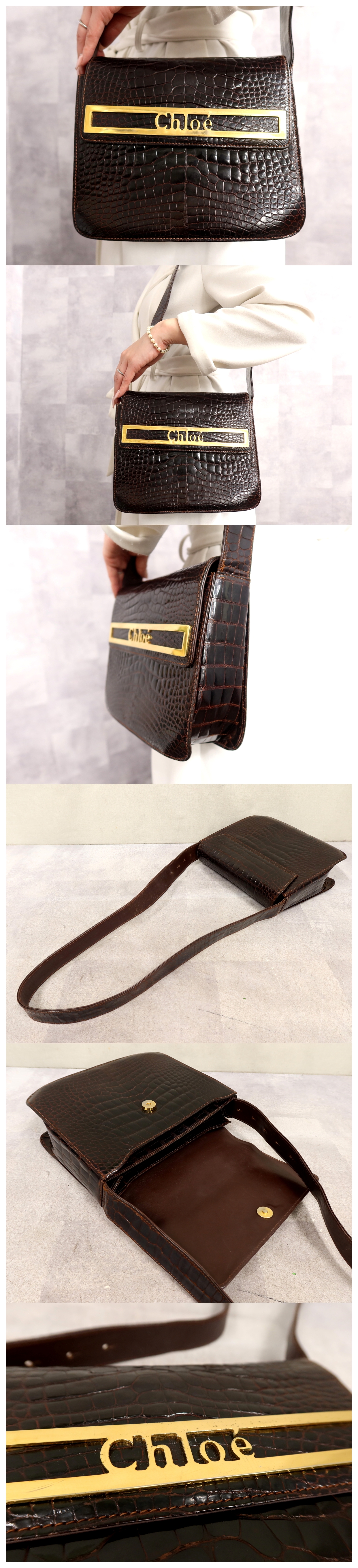 ●超美品●Chloe クロエ●ロゴ金具●クロコダイル 型押し レザー 本革●ショルダー バッグ●ダークブラウン●G金具●ヴィンテージ●Js65124 收藏