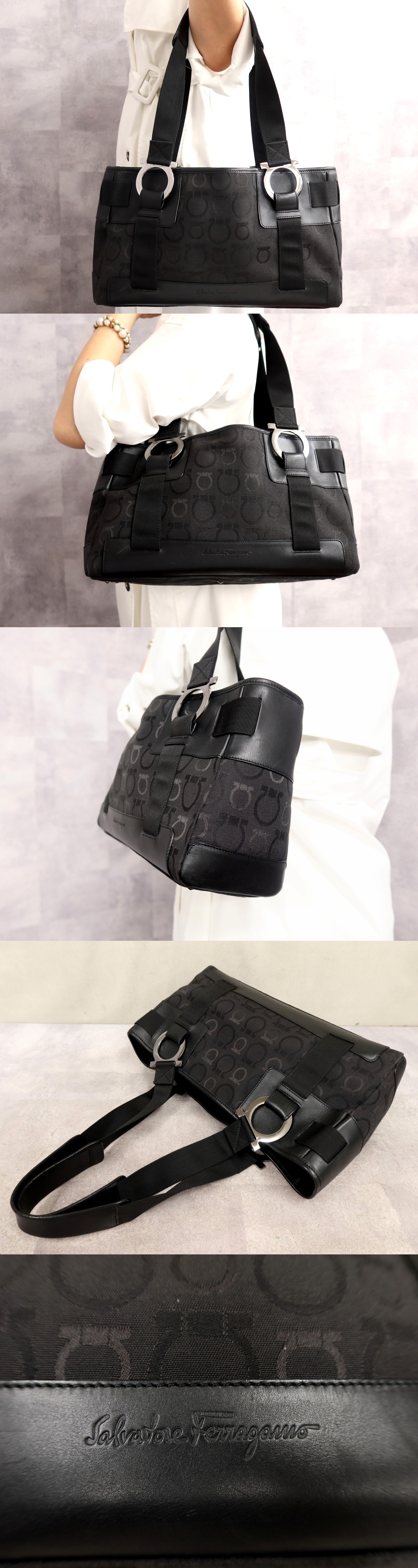 ●超美品●Salvatore Ferragamo フェラガモ●ガンチーニ●キャンバス カーフ レザー 本革●トート バッグ●黒●シルバー金具●B5●Js67272 收藏