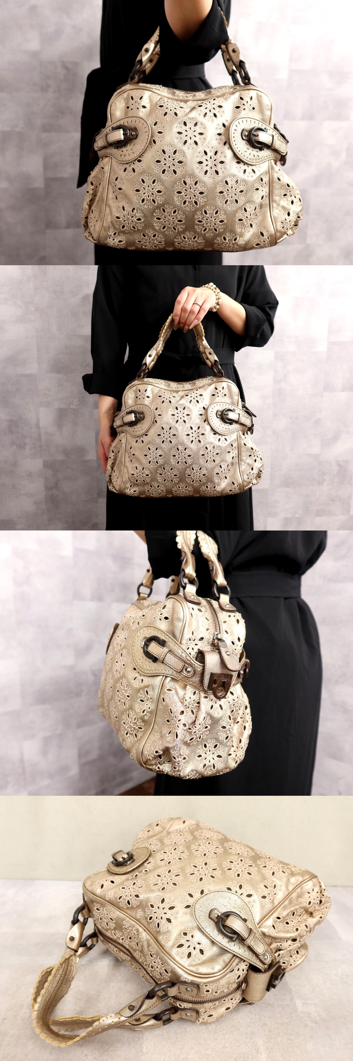 超美品●Salvatore Ferragamo フェラガモ●ウッドガンチーニ●カーフ レザー 本革●ハンド バッグ●ゴールド系●シルバー金具●B5●Js67380 收藏