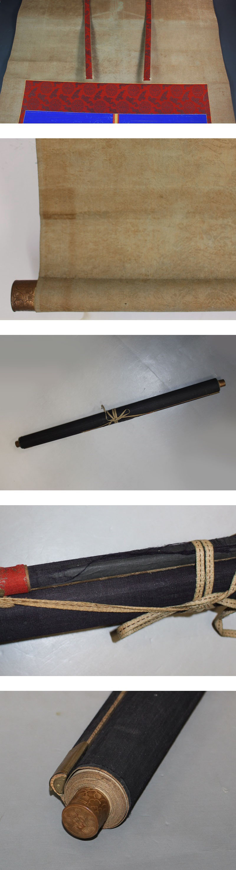 古仏画【親鸞聖人御絵伝】 本紙は、汚れ、折れ多数、皺多数、剥れがあります。 表装は、汚れ、折れ多数、ヤケ、虫食、裏側にほつれ、破れ、 軸先に傷、へこみがあります。 【サイズ】 作品 横約54cm×縦約100cm 表装 横約71cm×縦約171cm |