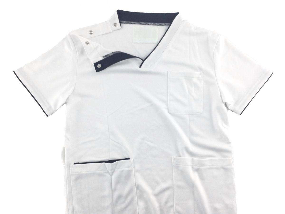 肩スナップスクラブ 男女兼用 ストレッチ 半袖 透け防止 吸水速乾 防臭 医療用 看護師 介護士 SS ホワイトxネイビー 送料250円 收藏