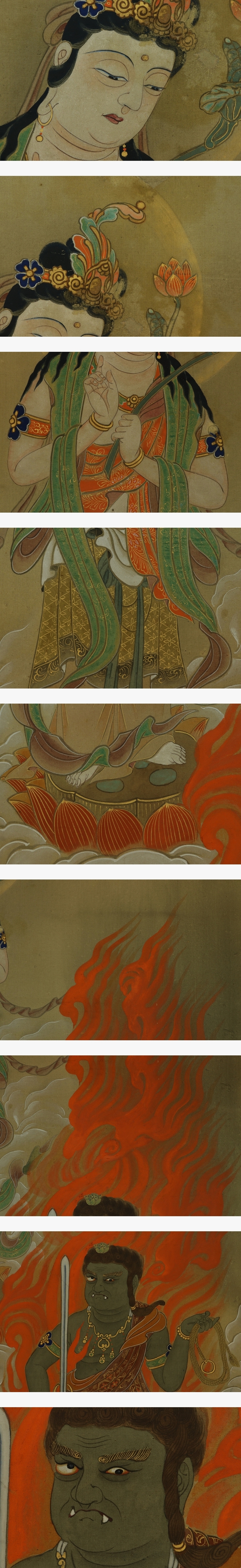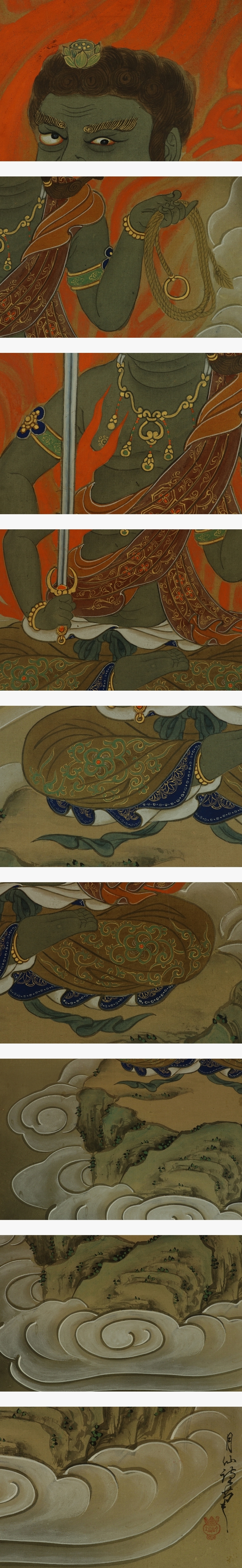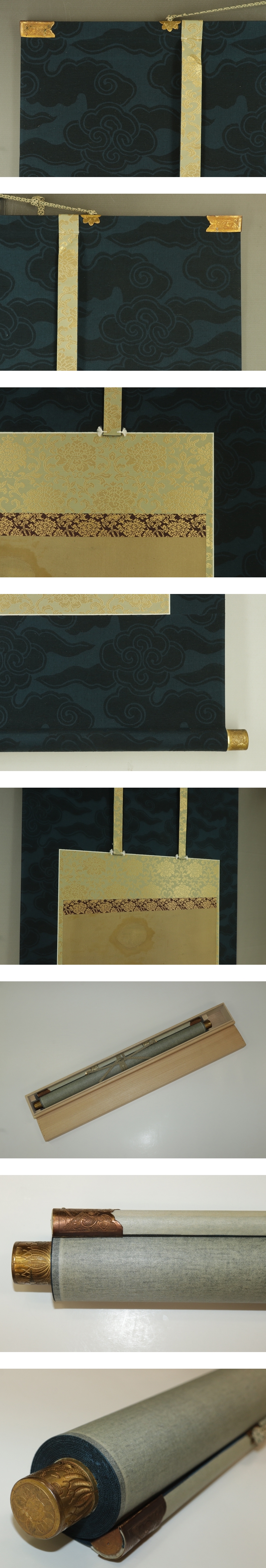 古仏画【不動に観音】 本紙は、染み痕、破れ修整痕があります。 表装は、良好です。軸先と金具部に変色があります。 【サイズ】 作品 横約42.5cm×縦約110cm 表装 横約59cm×縦約182cm |