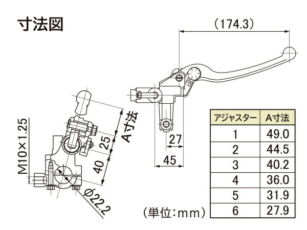 ※ご使用のキャリパーとの組み合わせによっては必要ブレーキ液圧が発生する前にレバーがグリップに当たり使用できないレバーアジャスター位置があります。レバーアジャスターの調整を行ない、ブレーキが十分に効き、なおかつレバーがグリップに接触しないレバーアジャスター位置でご使用ください。調整しきれない場合は別売りの4段調整レバー(バフクリアー/23319)または(ブラック/27354)をご使用ください。