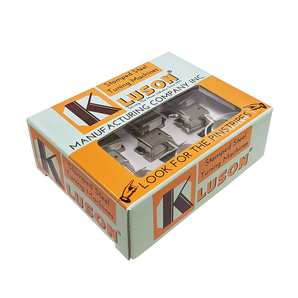 1963年後期からフェンダーの上級モデルで使用されていた、ヘッド片側に6個のペグが並ぶスタイル、金属製丸型チューニング・ノブ、スプリット・ストリング・ポスト、「2列刻印」、ニッケル・メッキ仕様の“クルーソン・デラックス”復刻ペグ。