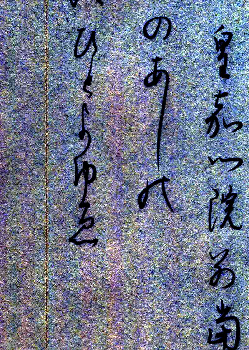 入手したものであることがわかりました。日本の和紙は(す)く製法であるため和紙の繊維が断層画像写真によって一本一本が立体的に見えます。オランダ渡来の髪と性質が異なるのはこのためです。は茶会用の掛軸から外され海外展示のために再表装をしております。掛軸や屏風にすることが可能なように、「Removable Paste(再剥離用糊)」を使用しているため、自筆の書に影響をあたえずに、容易に「剥離」することができるような特殊な表装となっております。 |