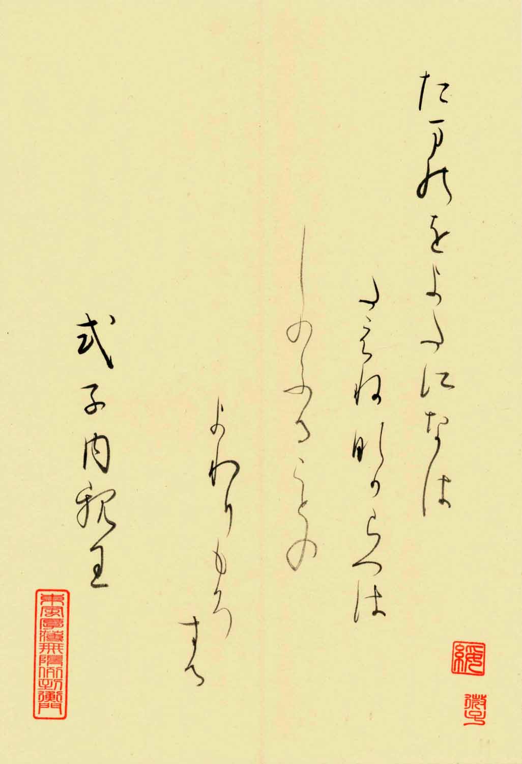 伊達徽子(のりこ)・自筆「百人一首」の和歌の書を出品いたしました。出品以外の所蔵品を紹介した出品者のホームページ「源氏物語の世界」をご覧ください。 ツイッター「源氏物語の世界」 も合わせてご覧ください。 |