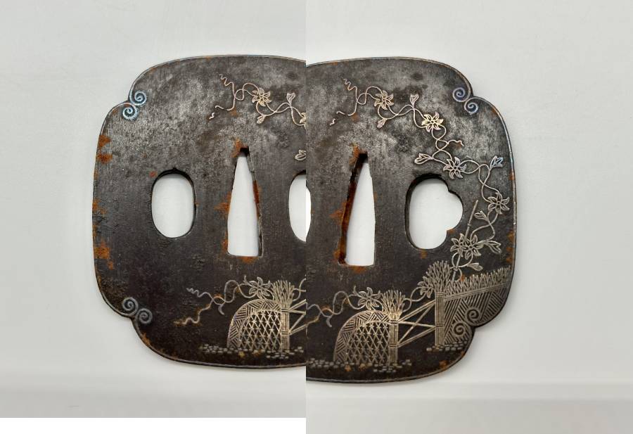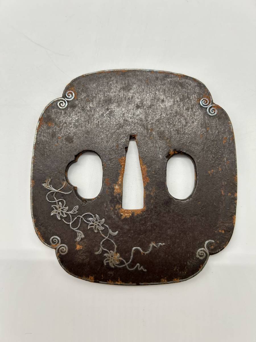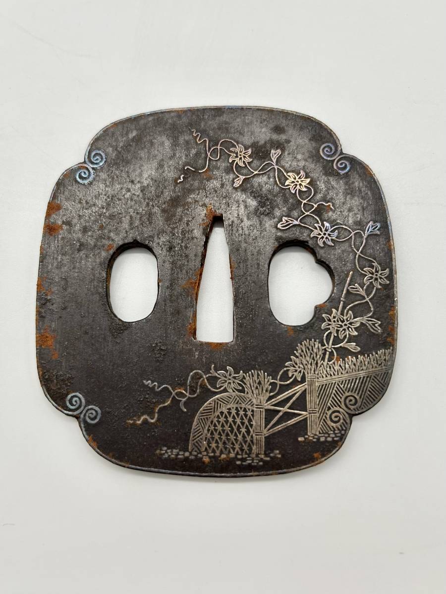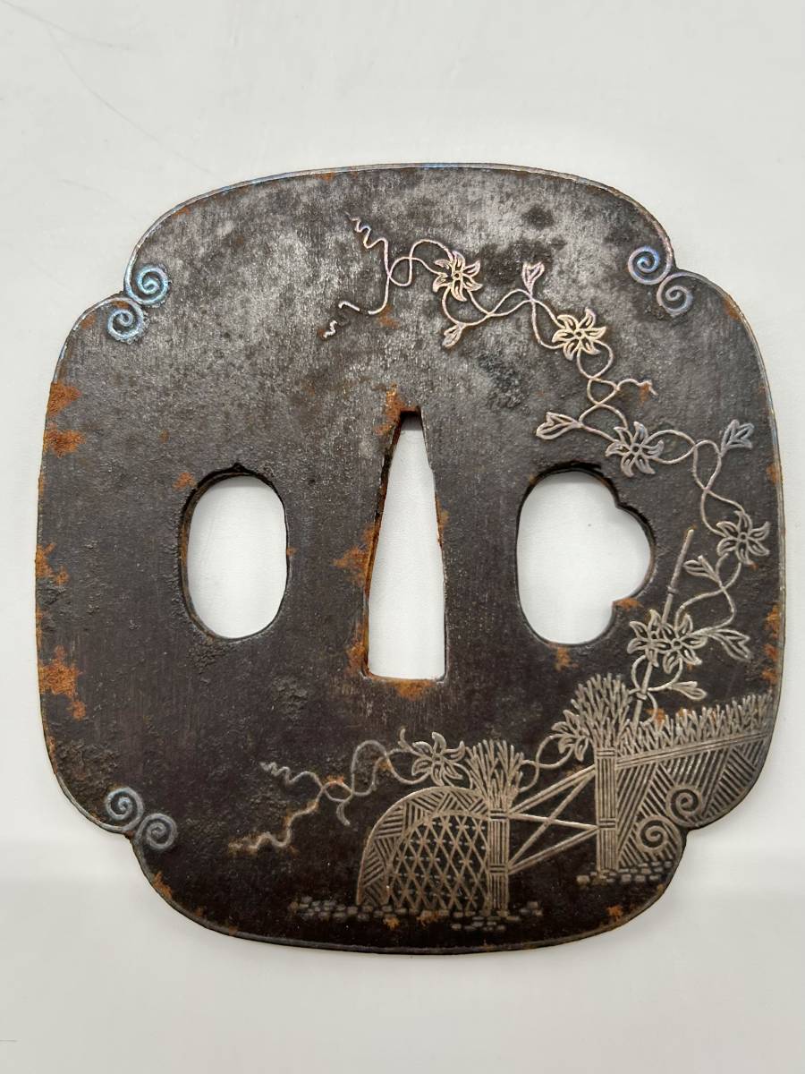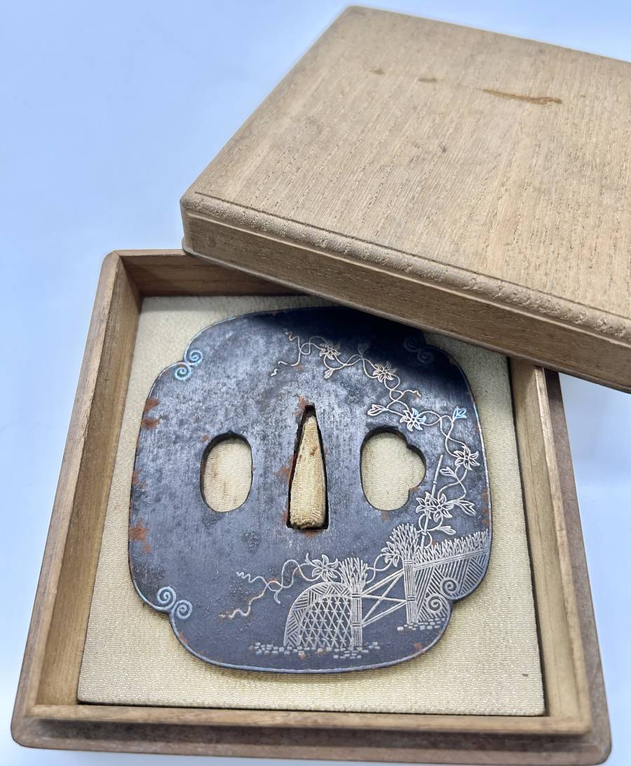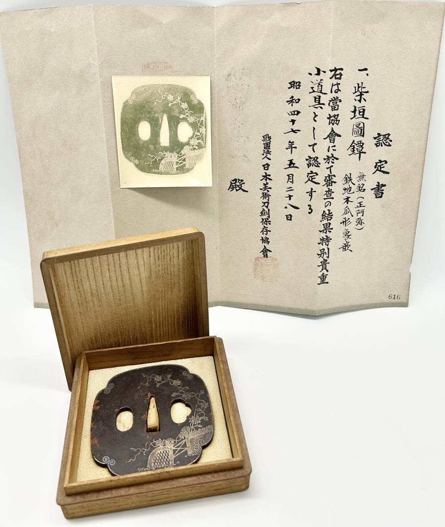 ●鍔 紫垣圖鐔 無銘 正阿弥 鉄地木瓜形象嵌 特別貴重小道具 認定書 刀装具 刀剣 武具