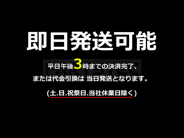 | よくあるご質問 | Q.休業日はいつですか? A.土曜日/日曜日/祝祭日となっております。年末年始やGWなどの休業日は『自己紹介』にてご案内させていただきます。 ※休業日にご連絡いただきましたご質問やその他の対応は『翌営業日(通常営業日)』に順次対応させていただきます。 Q.いつ発送されますか?(今日発送できますか?) A.平日午後3時までの決済完了、または代金引換は当日発送となっており、発送後は取引メッセージにてご連絡させていただきます。 ※土.日.祝祭日.当社休業日除く ※商品によっては代引きがご使用いただけません。 Q.いつ届きますか? A.商品ページ発送詳細の到着予定をご確認ください。 ※到着予定を過ぎた場合などはお手数ですがご連絡ください。 ※定形外発送の場合、お届けまでにお時間がかかります。 |