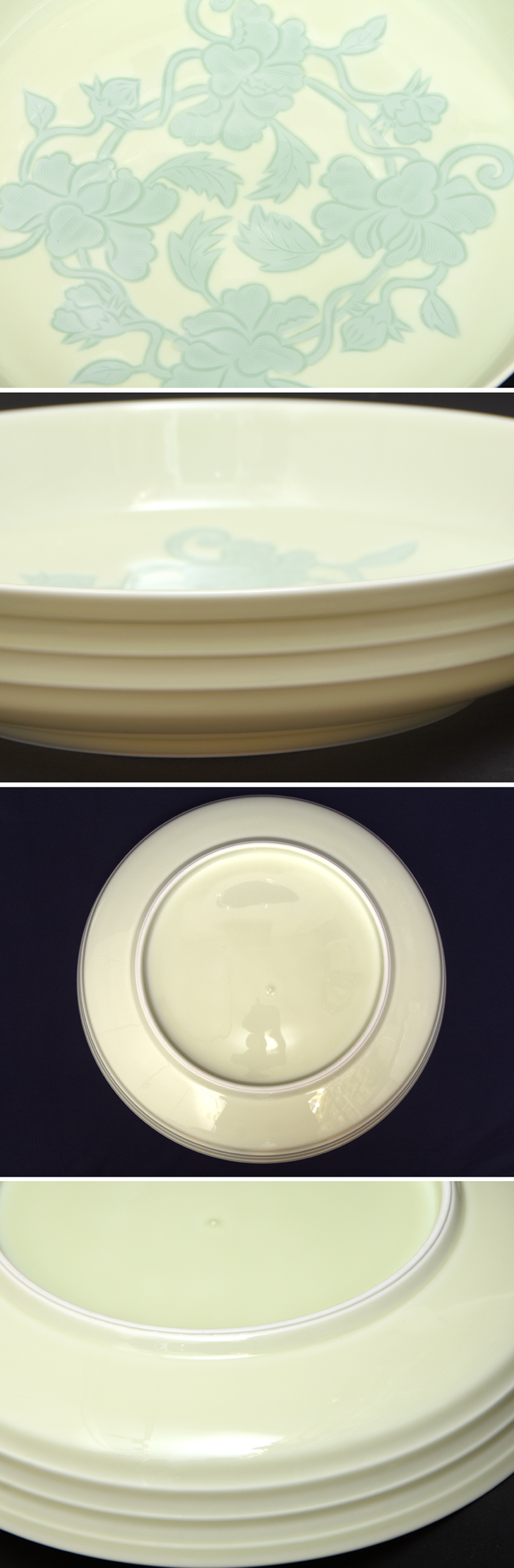 人間国宝 井上萬二(造)黄緑釉牡丹彫文鉢 共箱 口径:36.5㎝ 額皿 器 鉢 和食器 陶磁器 有田焼 重要無形文化財 u1570o 收藏