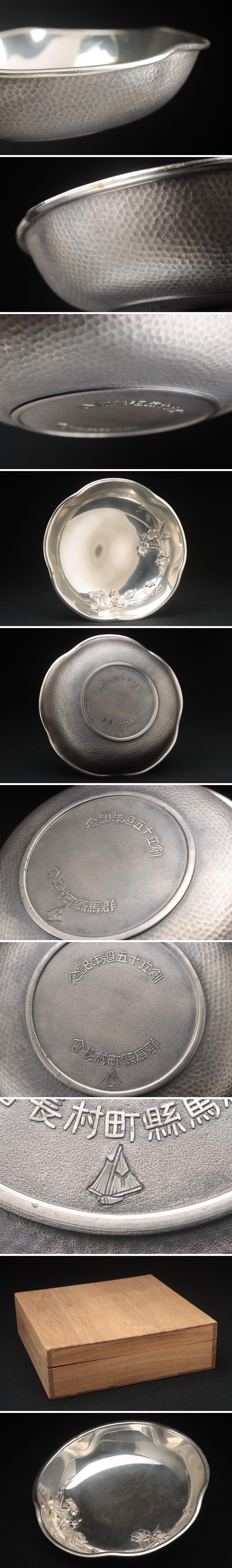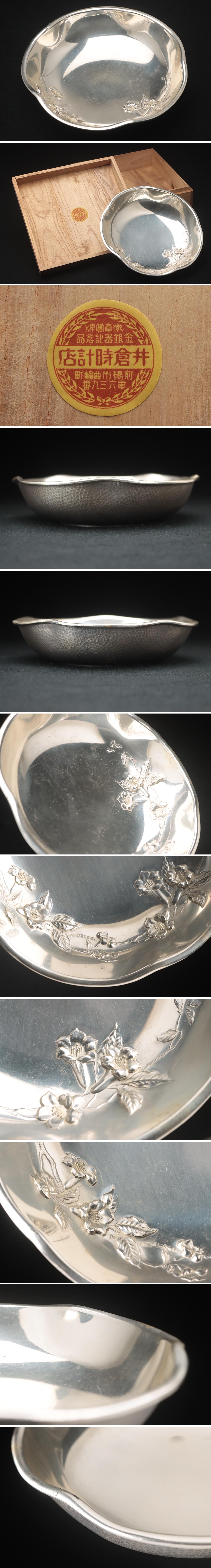 JR013 【井倉時計店 ヨット印】銀仕上 百合盛上文 輪花菓子器 径16cm / 重330g 共箱・菓子鉢 煎茶道具 收藏