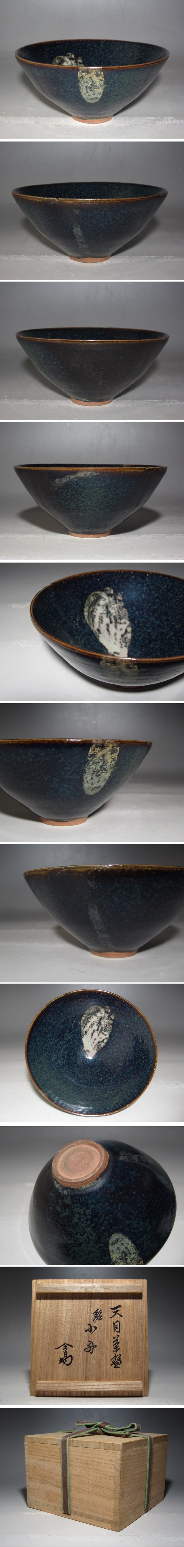 天目茶碗「小舟」です。 時代を感じる素晴らしい逸品です。 箱蓋裏に裏千家十四代淡々斎花押があります。 サイズ 直径12.5cm/高さ6cm(多少の誤差はお許しください) 状態 一見して疵やヒビ・直しは見られません。 骨董品という事をご勘案頂き、時代経過のスレや、小さな傷がある場合があるかもしれませんのでご承知置きください。 | |||