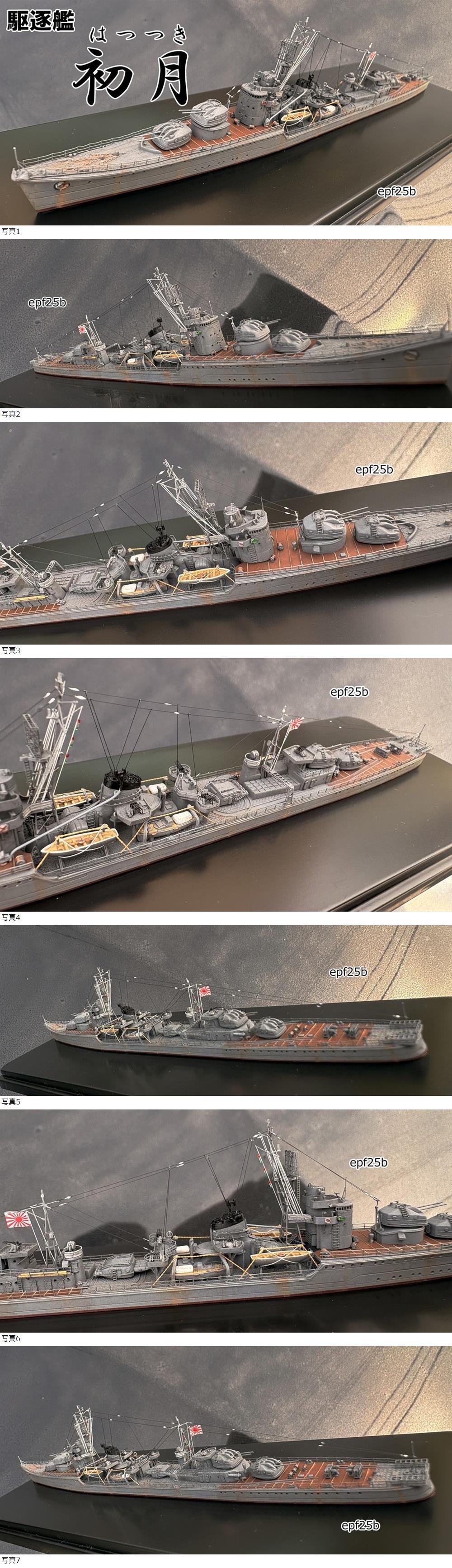 ご覧いただきありがとうございます キットはピットロード製です。 資料は写真集を参考に作製しています。 手直しした箇所は ①船体はパテで修正しています。 ②船体の窓は穴をあけなおしています。 ③リノリウム押さえ金具はランナーで再現しています。 ④リールは社外品を使用しています。 ⑤炊事煙突は真鍮で作り直しています。 ⑥マストは真鍮で作り直しています。 ⑦探照灯は社外品を使用しています。 ⑧砲塔は補強材・手すり・窓・ハッチなどをエッチングと自作で再現しています。 ⑨砲身は真鍮に交換しています。 ⑩艦橋は窓枠・手すり・はしご・ハッチ・モンキーラッタルなどをエッチングで再現しています。 ⑪艦橋の一部を新たに作り直しています。 ⑫双眼鏡は自作しています。 ⑬電探はエッチングで再現しています。 ⑭煙突は一部作り直しています。 ⑮蒸気捨て管は真鍮で作り直しています。 ⑯煙突はジャッキステイ・モンキーラッタルなどをエッチングで再現しています。 ⑰煙突のカバーはエッチングで再現しています。 ⑱内火艇などは社外品を使用しています。 ⑲ボートダビットはエッチング・プラ材で再現しています。 ⑳機銃は社外品を使用しています。 21)通風筒は一部自作しています。 22)魚雷発射管はジャッキステイ・手すり・ハッチ・モンキーラッタル・窓などをエッチングで再現しています。 23)爆雷装填台は社外品を使用しています。 24)爆雷投下はエッチングで再現しています。 25)木材置き場をエッチングで再現しています。 26)木材は自作しています。 他にもありますので、是非お手にとって御覧下さい。 駆逐艦 初月 日本海軍が太平洋戦争で運用した秋月型駆逐艦の4番艦。 1941年(昭和16年)7月末から1942年(昭和17年)12月末にかけて、舞鶴海軍工廠で建造された。 竣工後の1943年(昭和18年)1月15日、第十戦隊麾下の第61駆逐隊に編入される。姉妹艦「若月」「秋月」と共に、中部太平洋方面や南東方面における艦隊の護衛・各地への輸送任務に従事した。(Wikipediaより抜粋) |