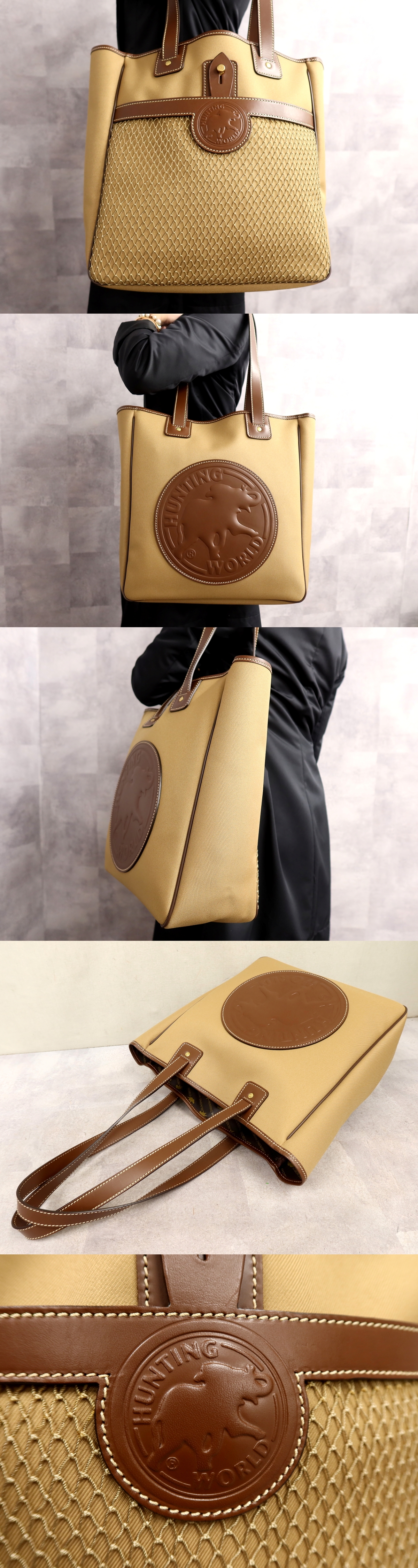 ●超美品●ハンティング・ワールド●サファリ●キャンバス カーフ レザー 本革●トート バッグ●ブラウン系●G金具●A4 書類 収納●Js66343 收藏