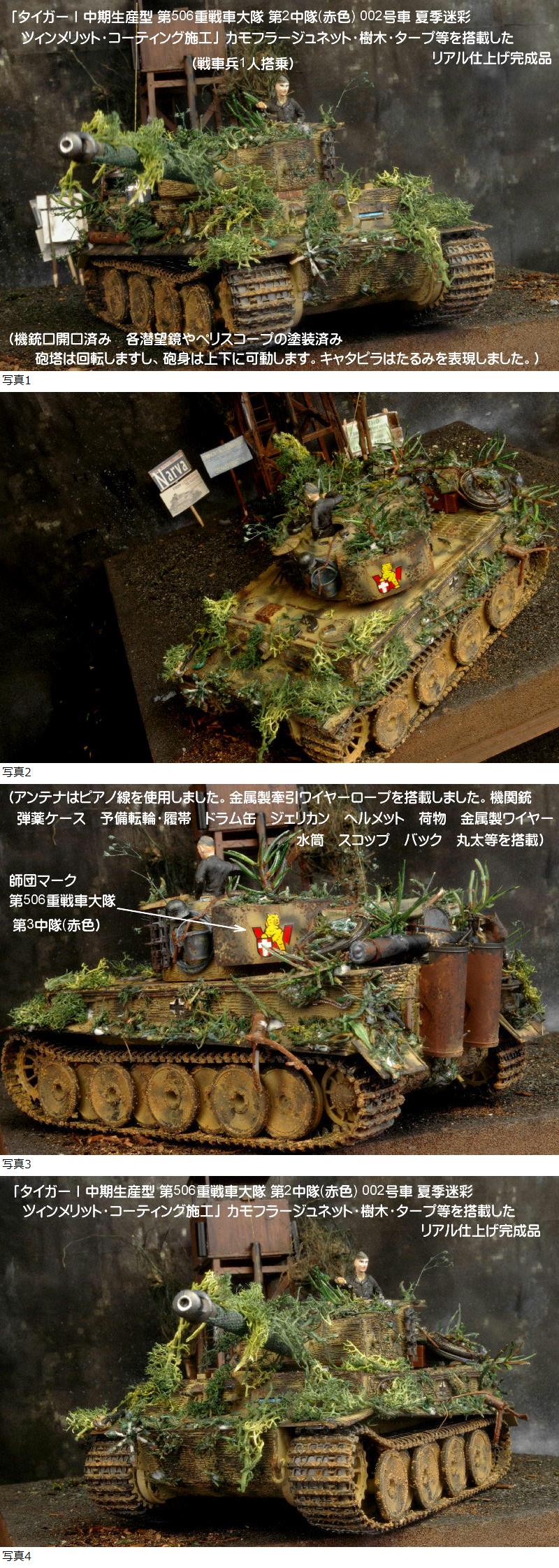 | ■今回の作品もジオラマではなく、単品完成品です。当店委託のプロモデラーが「ヘアスプレーチッピングやカモフラージュネット・樹木」等を施工するなどリアルに製作しており、クオリティは以下の商品説明の画像でも確認して下さいね。(撮影に使用したジオラマ展示台は、商品ではありませんよ。) ①1/35 「タイガーⅠ中期生産型 第506重戦車大隊 第2中隊(赤色) 002号車 夏季迷彩 ツィンメリット・コーティング施工」 カモフラージュネット・樹木・タープ等を搭載したリアル仕上げ完成品(第506重戦車大隊 部隊マーク 第1中隊白色 第2中隊赤色 第3中隊黄色 大隊本部黒色となっています。 ) (アンテナはピアノ線を使用しました。金属製牽引ワイヤーロープを搭載しました。機関銃 弾薬ケース 予備転輪・履帯 ドラム缶 ジェリカン ヘルメット 荷物 金属製ワイヤー 水筒 スコップ バック 丸太等を搭載しました。)ドイツ戦車兵1人を搭乗させました。 ※タイガーⅠ重戦車の生産は1942年8月に始まり、88mm砲の圧倒的な威力と重装甲で、連合軍を震え上がらせたドイツ軍の戦車です。師団マークは、第506重戦車大隊 第3中隊(赤色)002号車としました。 ■緻密で繊細に製作しており、とても精度の高い作品ですが、史実に忠実に表現したわけではありませんよ。(1943年 10月頃 東部戦線 ドニエプル川攻防戦を想定しました。) ■ヤフー画像検索で「PP工房完成品」と検索いただければ、当店の最近の作品の画像を見ることができますので、そちらも見ていただければ幸いです。・・・PP工房完成品 ★使用パーツなど(以下の作品がすべて付いてきますよ。) 1 1/35 タミヤ タイガーⅠ中期生産型(機銃口開口済み 各潜望鏡やペリスコープの塗装済み 砲塔は回転しますし、砲身は上下に可動します。キャタピラはたるみを表現しました。)ドイツ戦車兵1人を配置しました。 2 金属製ネームプレート板「第506重戦車大隊 タイガーⅠ」を配置しました。 ■当店(PP工房)では、プラモ完成品を週3回位の割合で出品しておりますので、よろしくおねがいしますね。 | |