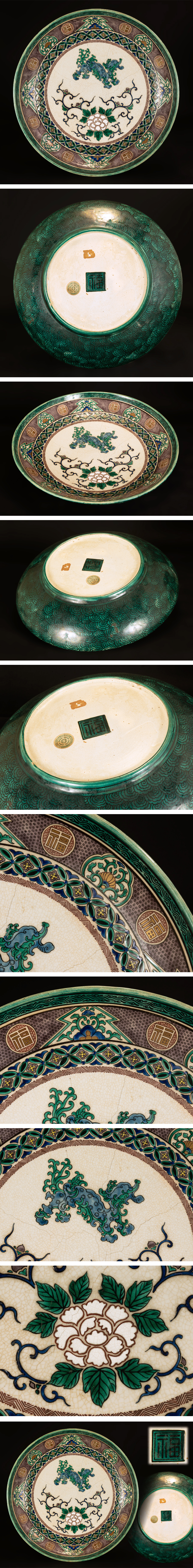 ●古九谷手 麒麟 牡丹文 大皿 直径約39センチ 輸出シール有 里帰り品 古い九谷● 收藏