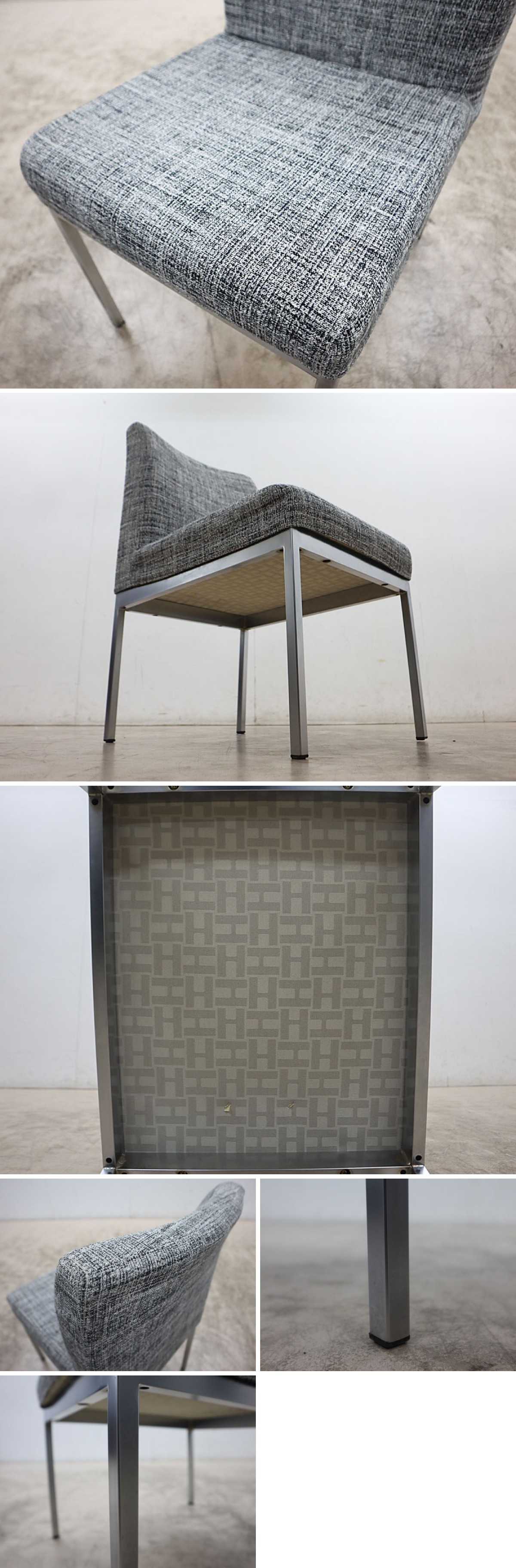 【仕様】 サイズ:約 W450×D600×H800・SH440mm ※実寸のため、多少の誤差はご了承ください。 素材:ファブリック、スチールパイプ サテンクロームメッキ仕上げ 張地カラー:グレー系(画像は100%正確な色味では御座いませんので気になるお客様は世田谷区船橋の倉庫でご覧頂けます。色味による返品、返金等は一切お受けできませんのでご了承の上でご入札をお願い致します。) ※パイプ脚(A) |
