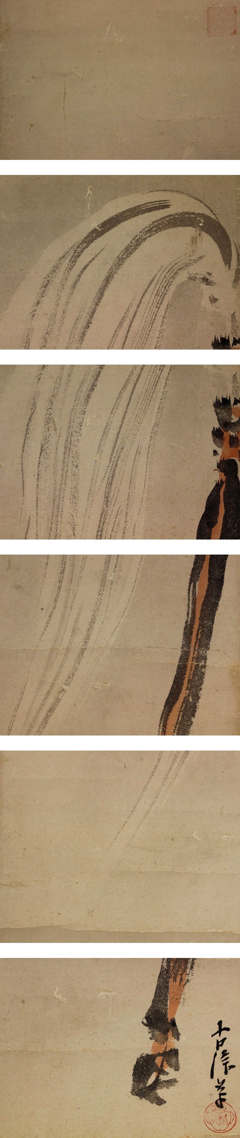 狩野古信 江戸中期の画家。木挽町狩野家五世。初名は庄三郎、号は栄川。如川周信の子。画法を父に学ぶ。享保13年父の後を継いで幕府の絵師となる。法印に叙せらる。享保16年(1731)歿、36才。 六如 りくにょ(1734-1801) 江戸時代中期-後期の僧,漢詩人。 享保(きょうほう)19年生まれ。天台宗。江戸寛永寺明静院,京都善光院などの住持。野村東皐(とうこう),宮瀬竜門にまなび,宋(そう)風の詩を提唱して当時の詩風に影響をあたえた。享和元年3月10日死去。68歳。近江(おうみ)(滋賀県)出身。俗姓は苗村。法名は慈周。号は白楼,無着庵。著作に「六如庵詩鈔」「葛原詩話」など。 本紙は、染み、汚れ、折れ多数、皺、虫食、擦れ、破れがあります。 表装は、染み、汚れ、折れ、皺、ヤケ、くすみ、破れ、軸先に汚れとヒビがあります。 【サイズ】 作品 横約27cm×縦約90cm 表装 横約36cm×縦約168cm |
